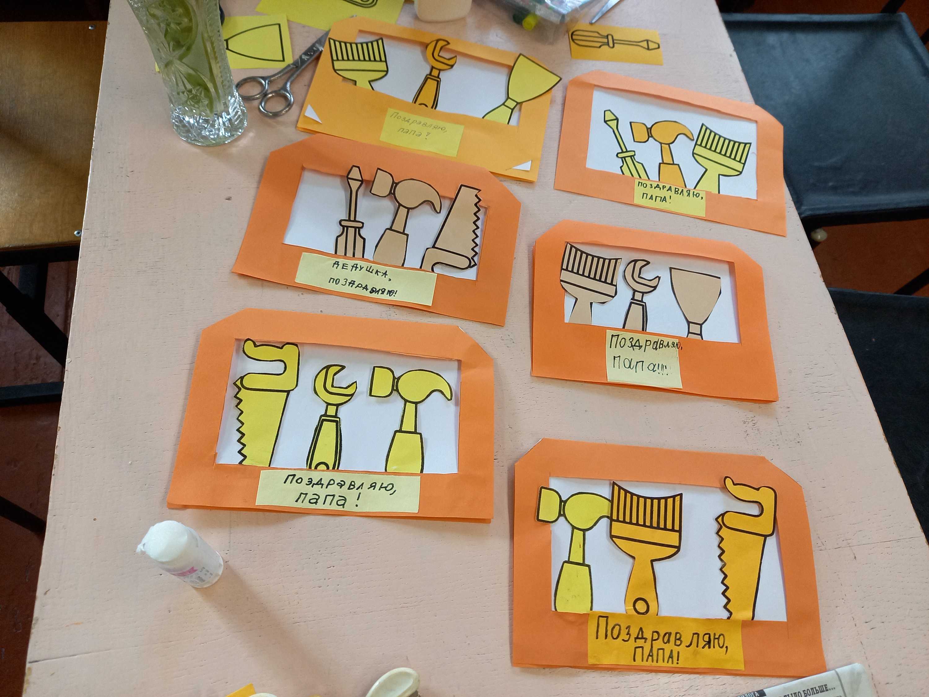 Лучший подарок - сделанный своими руками. И сегодня дочери и сыновья старательно делали открытки: отмеряли и разрезали, склеивали и подписывали. Получилось замечательно! Через неделю папы и дедушки будут очень рады такому знаку внимания.