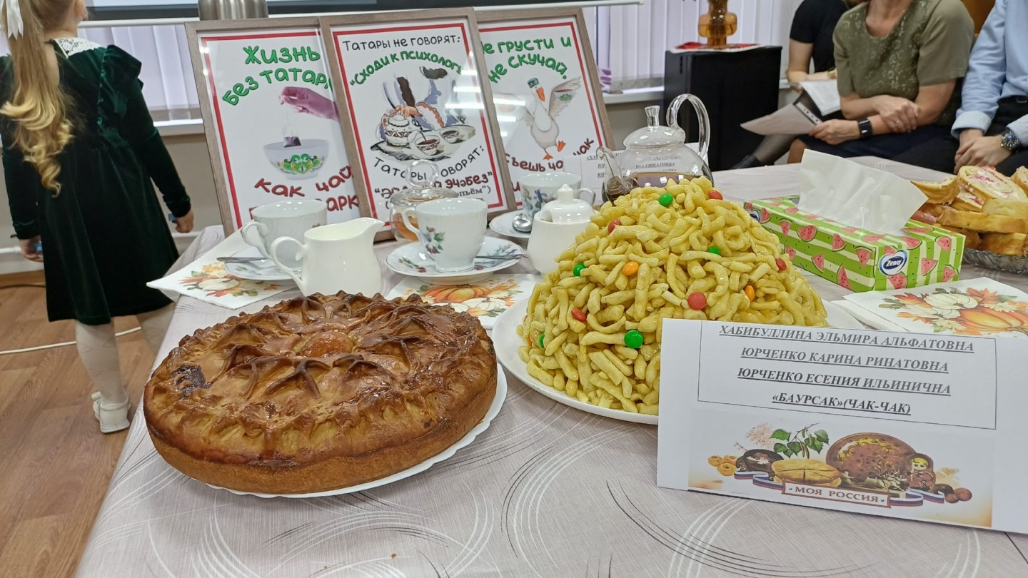 Татарскую кухню представляла дружная семья Хабибуллиных: Хабибуллина Эльмира Альфатовна, Юрченко Карина Ринатовна и Юрченко Есения. Они подготовили два огромных блюда: безумно вкусный традиционный «Баурсак» (чак – чак) и печеный пирог «Бэлиш» (бэлеш). Эльмира Альфатовна поделилась со всеми, как правильно заваривают чай в Татарстане и рассказала о своих национальных блюдах.