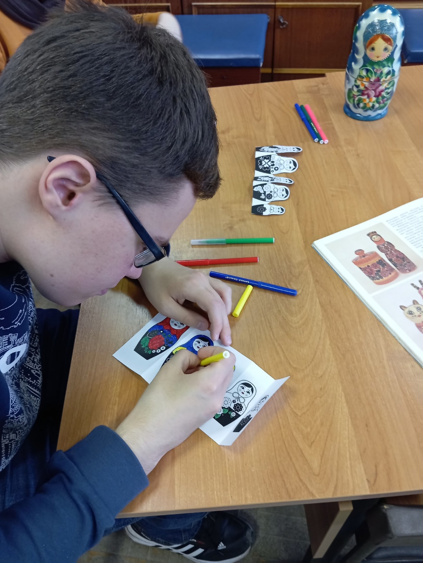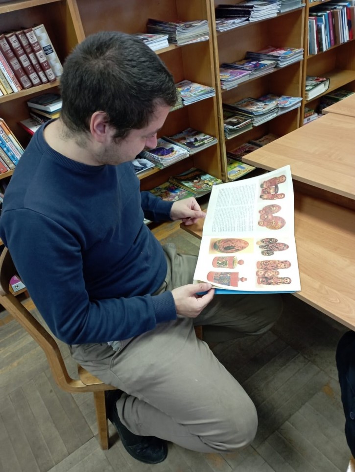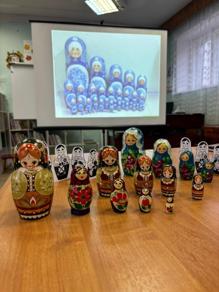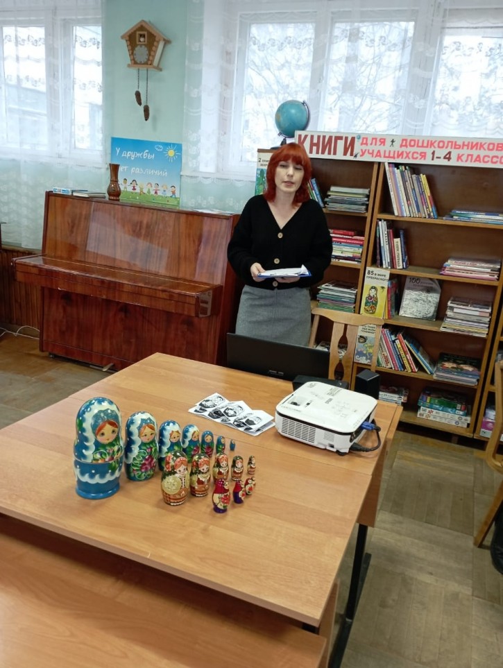 Во время мероприятия наши гости узнали историю создания матрёшки, почему именно это имя получила игрушка, технологию её производства, а также какие секреты она таит в себе и почему является символом России наряду с самоваром и берёзками. При просмотре презентации "Матрёшка - гордость и символ России" ребята познакомились с характерными особенностями формы и росписи матрёшек из Сергиева Посада, Семенова, Полховского Майдана и Вятки, с многообразием данной игрушки и узнали о том, что наша Семёновская 72 - местная кукла является самой большой в мире и занесена в "Книгу рекордов Гиннесса", а первый в мире музей матрёшек открыт в 2001 году в Москве. В завершении тематического часа был проведён мастер-класс по созданию и росписи бумажной матрёшки "Собери свою матрёшку".