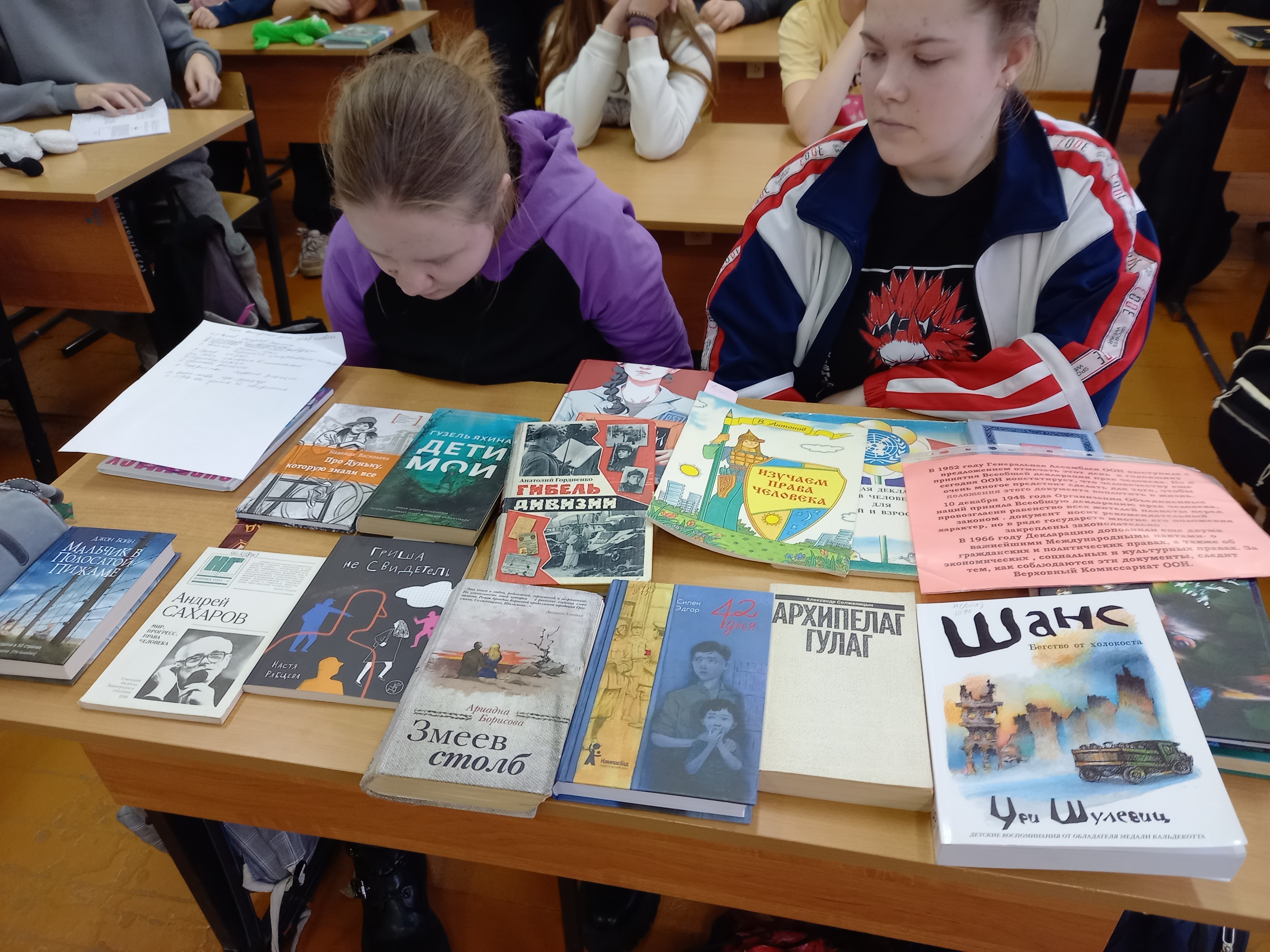 Обзор художественной литературы был посвящён Международному дню прав человека в честь принятия в 1948 г. Генеральной Ассамблеей ООН Всеобщей декларации прав человека. Читая произведения художественной литературы отечественных и зарубежных авторов, мы учимся адекватно воспринимать окружающий мир и совершенствовать его.