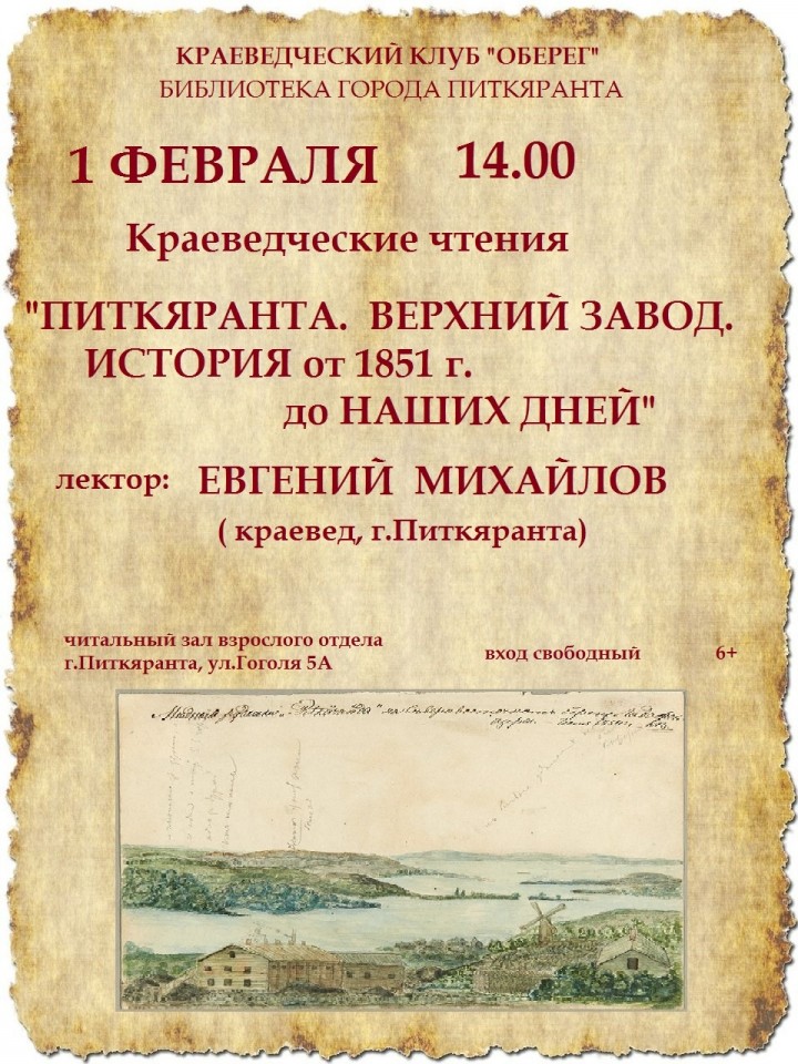 1 февраля в библиотеке состоялись первые в новом году Краеведческие чтения. У участников встречи была уникальная возможность погрузиться в промышленную историю Питкяранты. Свое краеведческое исследование представил Евгений Геннадьевич Михайлов, погрузив присутствующих в историю Верхнего завода, основанного в Питкяранте в 1851 году.
