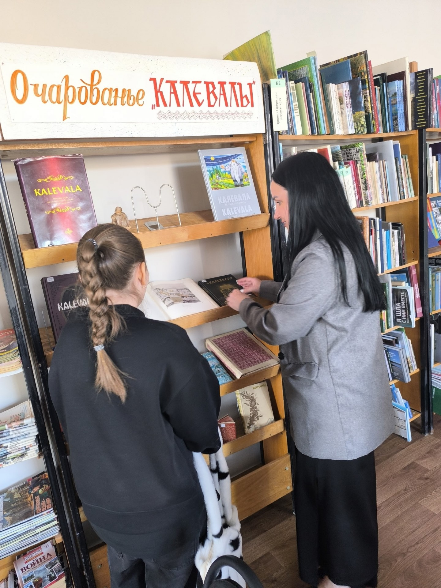 Далее мы с участниками познакомились с книжными выставками, посвященными карело-финского эпосу «Калевала», которые были представлены в разных интерпретациях во всех отделах нашей библиотеки.