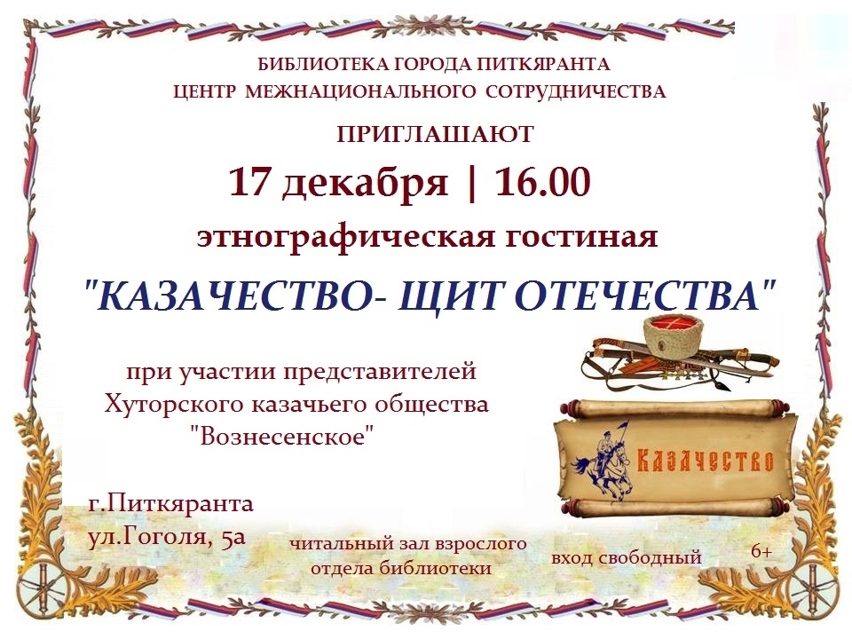 17 декабря в рамках деятельности Центра межнационального сотрудничества при библиотеке г.Питкяранта прошла этнографическая гостиная "Казачество- Щит Отечества" при участии представителей Хуторского казачьего общества «Вознесенское»: атамана, казаков и воспитанников .